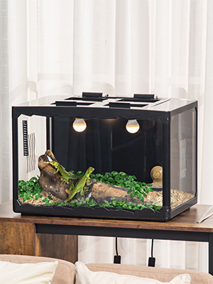 - CONTROLLO TEMPERATURA: Sono presenti 2 portalampade sotto la parte superiore, dotati di interruttore indipendente, in cui è possibile aggiungere lampadine. Adatto a tutti i tipi di rettili che hanno bisogno di riscaldarsi.